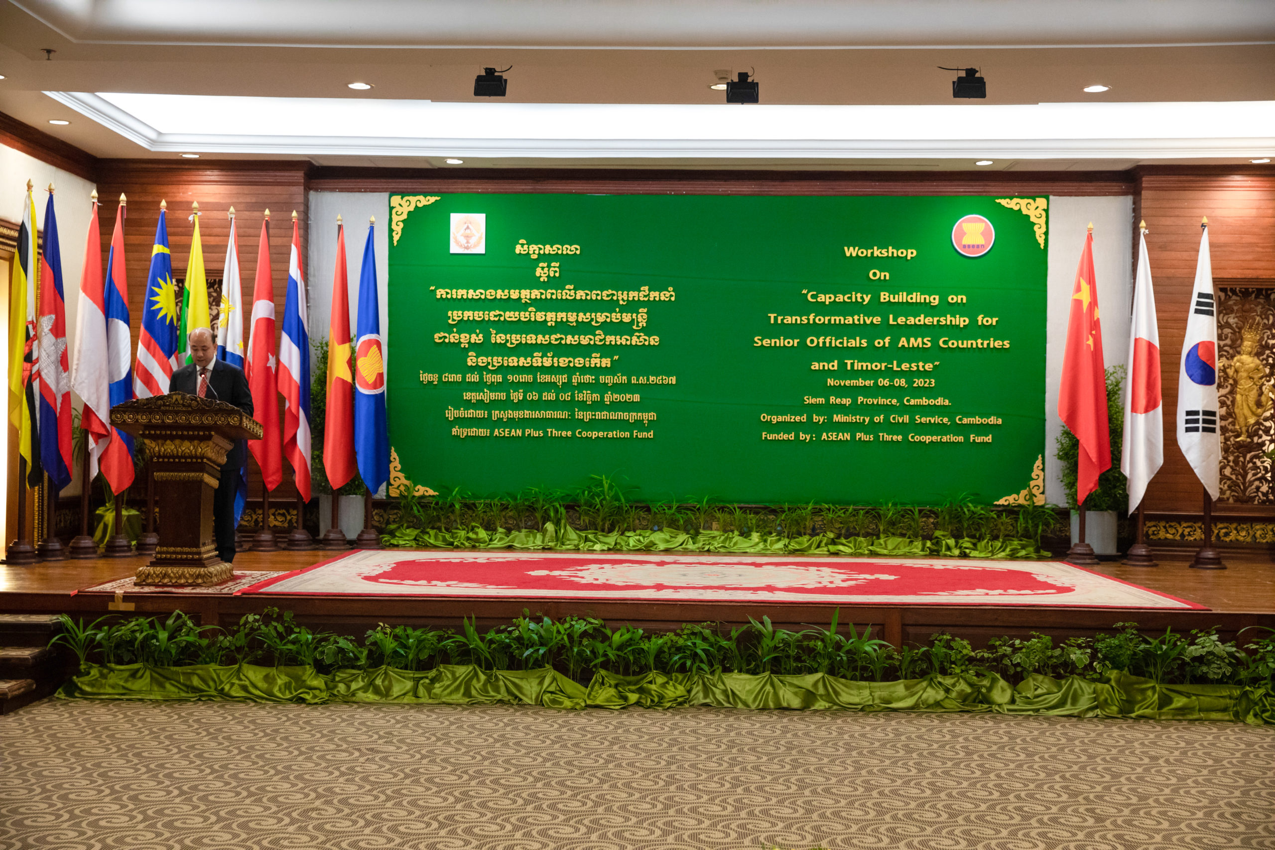 ជាកិច្ចស្វាគមន៍អង្គពិធី ឯកឧត្តម ឈុន សុជាតិ ប្រតិភូរាជរដ្ឋាភិបាលទទួលបន្ទុកជាអគ្គនាយក នៃអគ្គនាយកដ្ឋានគោលនយោបាយមុខងារសាធារណៈ នៃក្រសួងមុខងារសាធារណៈ បានធ្វើរបាយការណ៍សង្ខេបអំពីការរៀបចំសិក្ខាសាលា ដោយបានបញ្ជាក់ថា នៅក្នុងក្របខណ្ឌ កិច្ចសហប្រតិបត្តិការលើវិស័យមុខងារសាធារណេះអាស៊ានបូកបី ក្រសួងមុខងារសារធារណៈកម្ពជា បានផ្តួចផ្តើមគម្រោងស្តីពី (Transformative Leadership) នៅក្នុងផែនការសកម្មភាព ២០២១ -២០២៥ ដោយមានការគាំទ្រពីមូលនិធិកិច្ចសហប្រតិបត្តិការអាស៊ានបូកបី(ASEAN+3 Cooperation Fund)។ ក្នុងគម្រោងនេះ ក្រសួងមុខងារសាធារណៈ ត្រូវរៀបចំសិក្ខាសាលាស្តីពីការកសាងសមត្ថភាពលើភាពជាអ្នកដឹកនាំប្រកបដោយបរិវត្តកម្មសម្រាប់មន្រ្តីជាន់ខ្ពស់នៃប្រទេសជាសមាជិកអាស៊ាន និងប្រទេសទីម័រខាងកើត ចំនួន២ លើក ដែលលើកទី១ បានរៀបចំកាលពីខែសីហា ឆ្នាំ២០២៣ ដែលមានអ្នកចូលរួមជាមន្រ្តីកម្រិតប្រធាននាយកដ្ឋានទាំងជាតិ និងអន្តរជាតិប្រមាណ ១៧០ នាក់ ។ ការរៀបចំសិក្ខាសាលាពេលនេះ គឺជាសិក្ខាសាលាលើកទី២ ដែលមានអ្នកចូលរួមកម្រិតអគ្គនាយកទាំងជាតិ និងអន្តរជាតិចំនួន សរុប ១១៩ នាក់។
