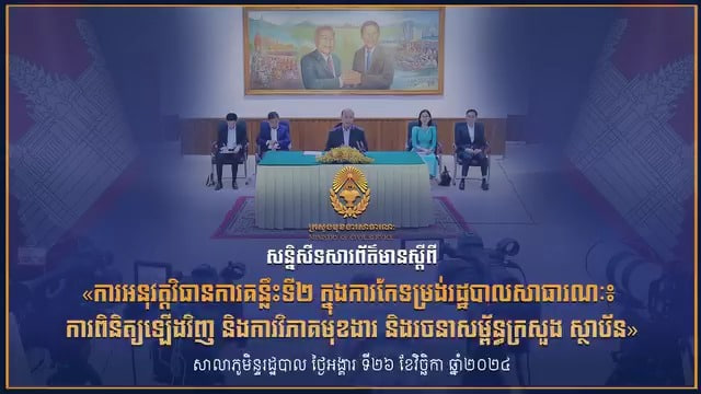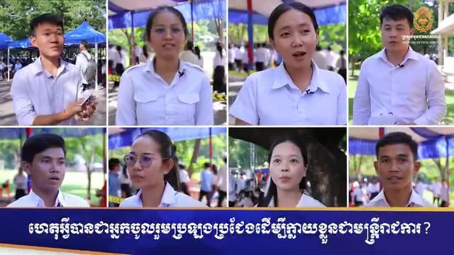 បណ្ណាល័យវីដេអូ អក្សរពីតូចទៅធំ អក្សរពីធំទៅតូច បណ្តាញសង្គម Facebook ទំនាក់ទំនងគេហៈទំព័រផ្សេងៗ ភ្ជាប់គេហទំព័រផ្សេងៗ ទីស្ដីការគណៈរដ្ឋមន្ត្រី រដ្ឋសភា ព្រឹទ្ធសភា អគ្គនាយកដ្ឋានពន្ធដារ តុលាការកំពូល និង មហាអយ្យការ អគ្គស្នងការនគរបាលជាតិ រដ្ឋាបាលព្រៃឈើ អាជ្ញាធរ អប្សារា ក្រសួងមហាផ្ទៃ ក្រសួងការបរទេស ក្រសួងការពារជាតិ ក្រសួងសេដ្ឋកិច្ច និង ហិរញ្ញវត្ថុ ក្រសួងបរិស្ថាន ក្រសួងអប់រំយុវជន និងកីឡា ក្រសួងពាណិជ្ជកម្ម ក្រសួងកសិកម្ម រុក្ខាប្រមាញ់ និងនេសាទ ក្រសួងសាធារណៈការ និងដឹកជញ្ជួន ក្រសួងវប្បធម៌ និងវិចិត្រសិល្បៈ ក្រសួងឧស្សាហកម្ម និងសិប្បកម្ម ក្រសួងរ៉ែ និងថាមពល ក្រសួងធម្មការ និងសាសនា ក្រសួងអភិវឌ្ឍន៍ជនបទ ក្រសួងព័ត៍មាន ក្រសួងធនធានទឹក និង ឧតុនិយម ក្រសួងទំនាក់ទំនងជាមួយរដ្ឋសភា-ព្រឹទ្ធសភា និង អធិការកិច្ច ក្រសួងកិច្ចការនារី ក្រសួងទេសចរណ៍ ក្រសួងសង្គមកិច្ច-អតីតយុទ្ធជន និង យុវនីតិសម្បាទា ក្រសួងសុខាភិបាល ក្រសួងយុត្តិធម៌ ក្រសួងការងារ និង បណ្តុះបណ្តាលវិជ្ជាជីវៈ ក្រសួងរៀបចំដែនដី នគរូបនីយកម្ម និង សំណង់ បេក្ខជនដែលធ្លាប់បានចូលរួមប្រឡងប្រជែងក្លាយជាមន្ត្រីរាជការស៊ីវិលចំនួន៣រូប ៣ប្រឡងផ្សេងគ្នា បានដាក់ពាក្យចូលរួមជាអ្នកសង្កេតការណ៍សាធារណជនស្ម័គ្រចិត្ត ក្នុងចំណោមអ្នកសង្កេតការណ៍ផ្សេងទៀត 555 Views | ២២-ធ្នូ-២០២៤ ការប្រឡងប្រជែងជ្រើសរើសសិស្សមន្ត្រីជាន់ខ្ពស់ ជំនាន់ទី១៣ នៃសាលាភូមិន្ទរដ្ឋបាល ដែលមានបេក្ខជនចូលរួមចំនួន ១៥៤អង្គ/នាក់ (ស្រី ៥៤នាក់) ត្រូវបានបញ្ចប់នៅម៉ោង ៦ល្ងាច។ បេក្ខជនដែលជាប់ លើវិញ្ញាសាសរសេរលើកទី២ នេះ នឹងត្រូវបន្តចូលរួមការប្រឡងដំណាក់កាលចុងក្រោយ គឺវិញ្ញាសាសំណួរផ្ទាល់មាត់ 996 Views | ១០-ធ្នូ-២០២៤ ការប្រឡងប្រជែងជ្រើសរើសមន្ត្រីរាជការស៊ីវិល ក្រោមការដឹកនាំរបស់ឯកឧត្តមឧបនាយករដ្ឋមន្ត្រី ហ៊ុន ម៉ានី និងថ្នាក់ដឹកនាំគ្រប់លំដាប់ថ្នាក់ មិនត្រឹមតែបានគិតគូរយ៉ាងហ្មត់ចត់លើនីតិវិធីនៃការប្រឡងនោះទេ ថែមទាំងបានគិតគូរដល់ការរៀបចំអាហារសម្រន់ ចង្ហាន់ត្រង់ អាហារថ្ងៃត្រង់ រួមទាំងភេសជ្ជៈសម្រាប់បេក្ខជន និងក្រុមគ្រួសារបេក្ខជនផងដែរ 748 Views | ១០-ធ្នូ-២០២៤ “យើងខ្ញុំគោរពដឹងគុណអ្នកជំនាន់មុន ដែលបានលះបង់ ខិតខំប្រឹងប្រែងកសាង អភិវឌ្ឍប្រទេសជាតិពីបាតដៃទទេរហូតបានមកដល់ពេលបច្ចុប្បន្ន 627 Views | ៥-ធ្នូ-២០២៤ ឯកឧត្តមឧបនាយករដ្ឋមន្ត្រី ហ៊ុន ម៉ានី មានប្រសាសន៍ថា “ការកែទម្រង់ទាំងអស់មកដល់ពេលនេះ ពីអាណត្តិមុនៗ មិនដែលធ្វើឱ្យបាត់បង់ផលប្រយោជន៍មន្ត្រីរាជការស៊ីវិល ដែលមានចែងដោយច្បាប់នោះទេ” 574 Views | ៤-ធ្នូ-២០២៤ សូមអញ្ជើញទស្សនាវីដេអូនៃការចូលរួមក្នុងទិវាជនមានពិការភាពកម្ពុជាលើកទី២៦ និងទិវាជនមានពិក